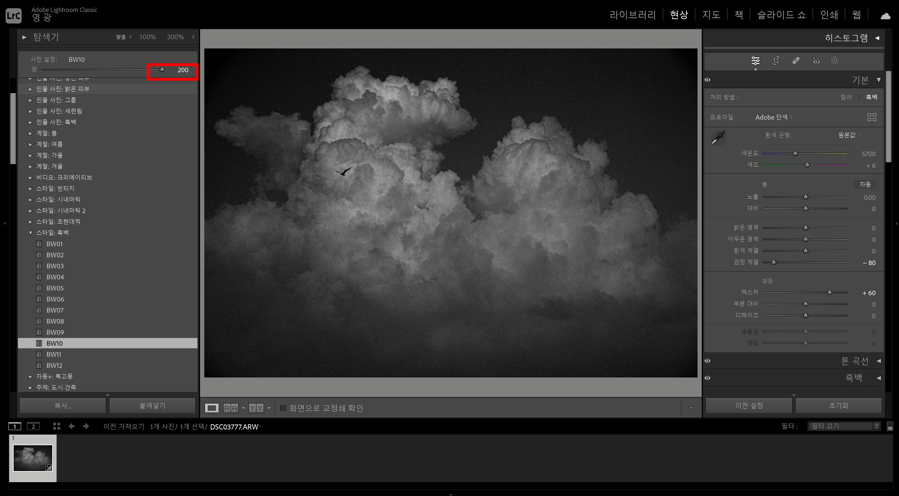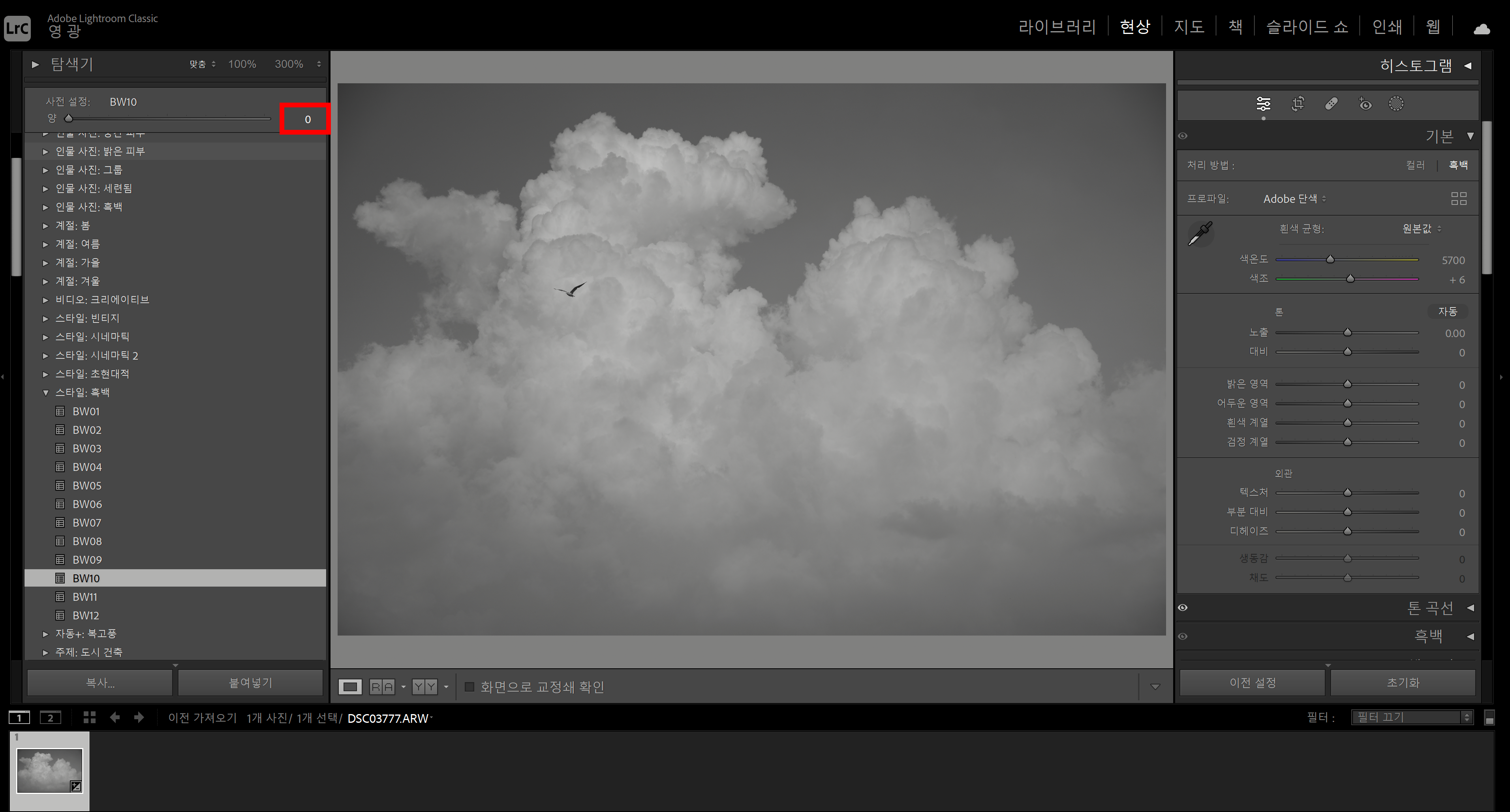 스타일: 흑백을 누른 후 bw01~12 사이 값중에서 색상이 마음이 드는 값을 골랐다.